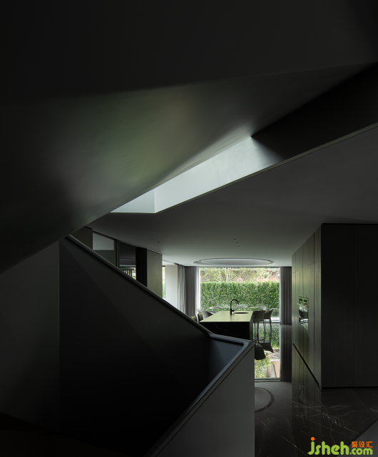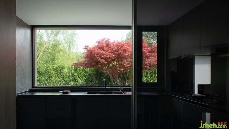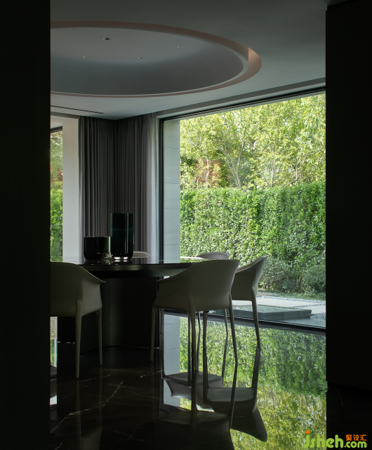 餐厨空间融合了传统的景观理念,与室内外进行了一场自然的对话与交融。在沉淀着醇厚底蕴的同时,也彰显了空间的奢华气质。圆形餐桌置于转角落地窗前,不论四季变换,都能为家庭聚餐带来不同的自然风景。西厨的岛台与中厨餐厅采用了流动隔断,或干脆不做隔断,既延续了空间的流动性,也为家庭生活的互动提供了更多可能。
