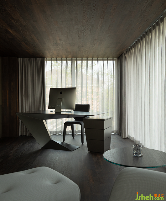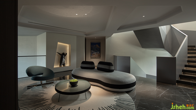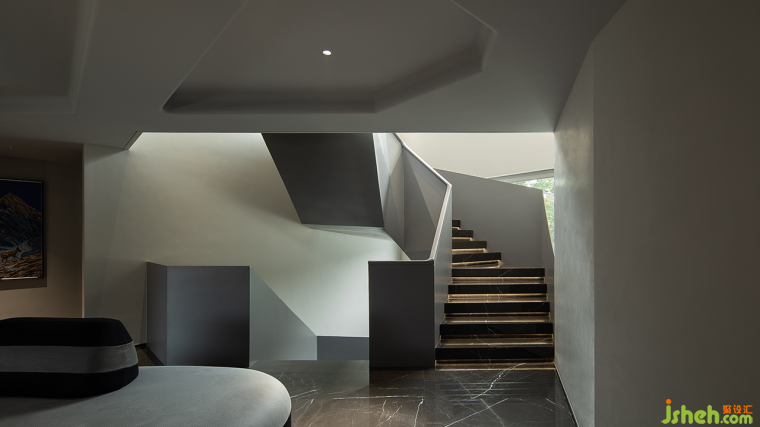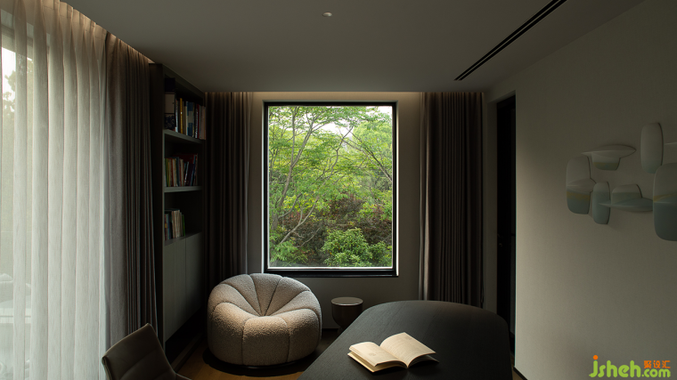 拾阶而上,二层以浅灰色为基调,酝酿出生活的韵味。折线形楼梯与沙发的摆件为日常起居增添了艺术趣味。闲暇时光,一间小巧的书房,两面临窗,成为静思独处的理想之地。一杯清茶,一张柔软的沙发,无论是临时办公,还是沉浸于书籍,方正安静的角落皆为绝佳选择。