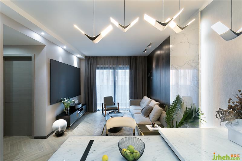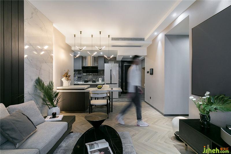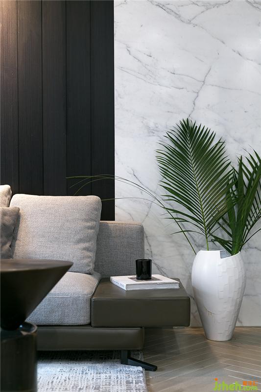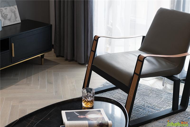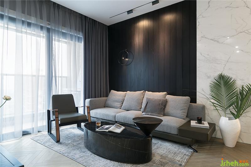 空间使用棉麻、劳伦黑金、真皮、木饰面这些丰富的材质,色彩归纳于黑白灰的基调中,让空间统一又富有变化。装修公司