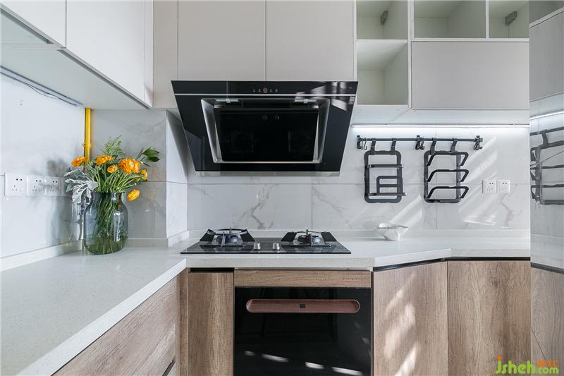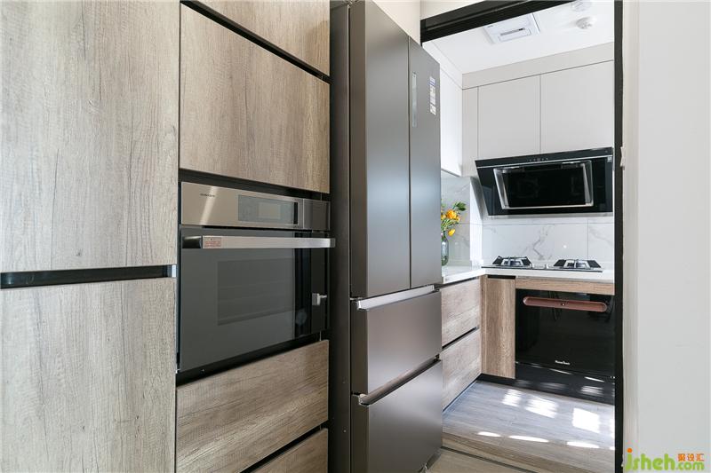 厨房门设计成三折的推拉门,油烟不大的时候可以隐藏在冰箱侧面(其实大部分是打开的),厨房的空间更加的通透。