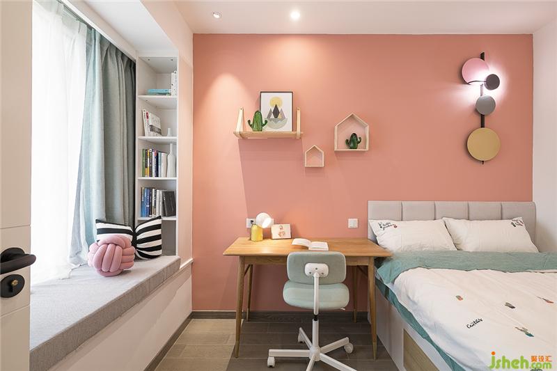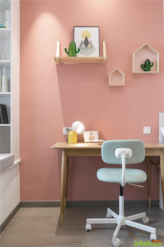 果然每个小女孩心里都住了一个公主,粉色当选成女儿房间的主色担当。其他的部分使用原木和淡绿色来达到平衡的效果。书桌旁是放置竖琴的地方。装修设计