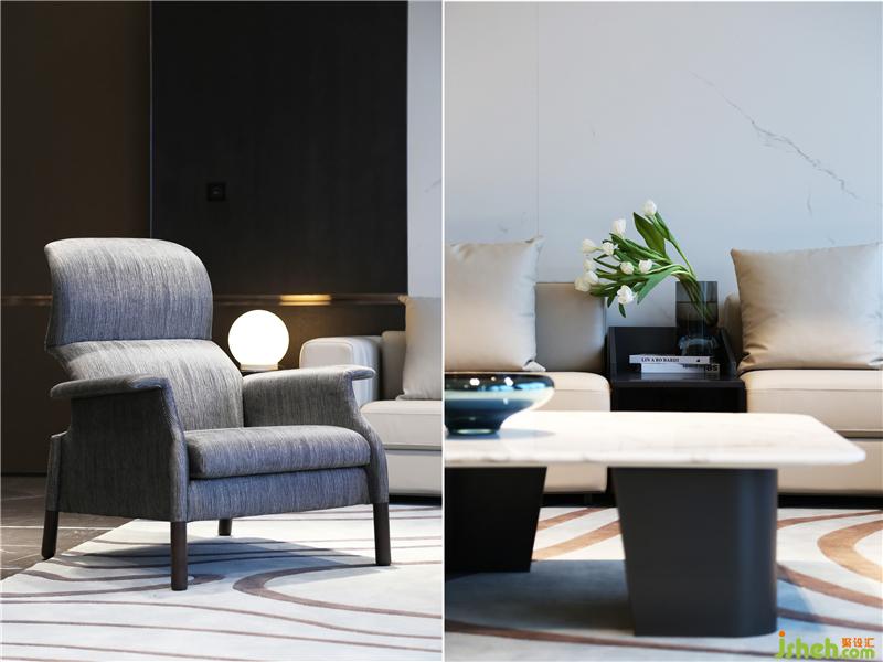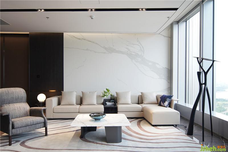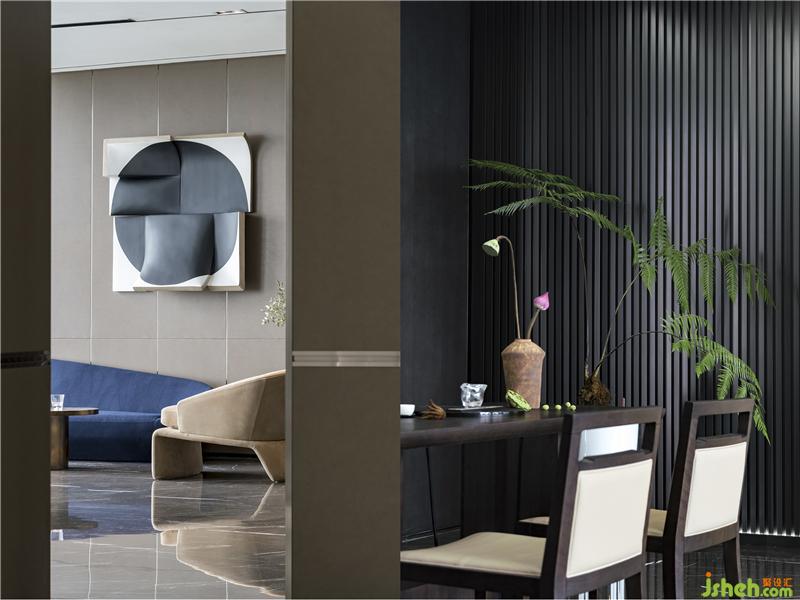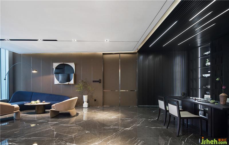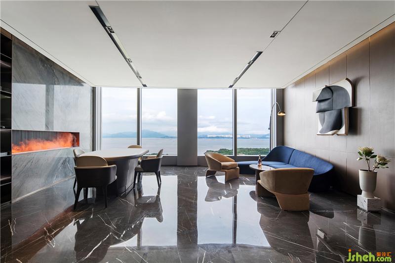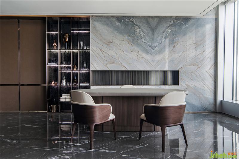 茶室和德州扑克/品酒区集合在休闲区,东西方的商务接待礼仪的协调共融。磨砂皮质地/羊毛呢/石材的材质凸显高贵品质,配合舒适和开阔的景色,旨在打造开怀畅饮相聚言欢的场景体验。
