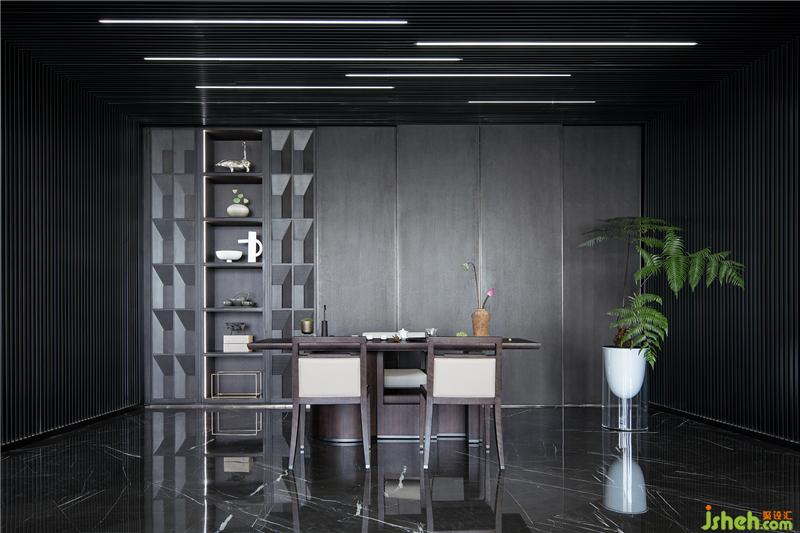茶室的天花板与墙面模糊了边界,形成一个独立的空间体。石材上的茶桌倒影像平静的海面--平和悠然,以茶会友,诠释品赏茶的美感之道。