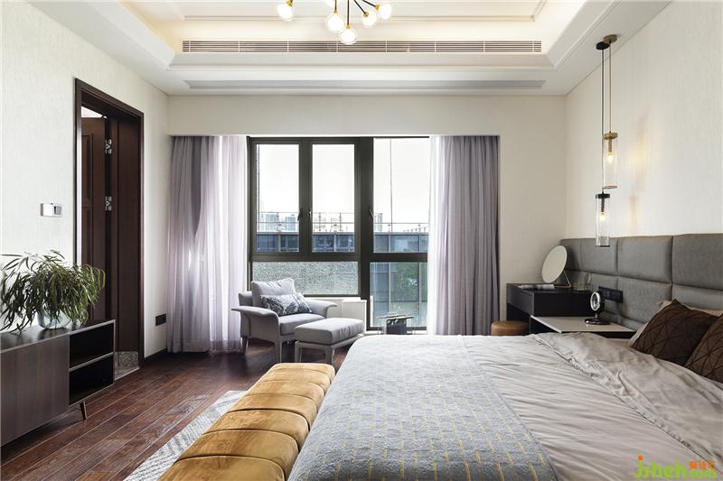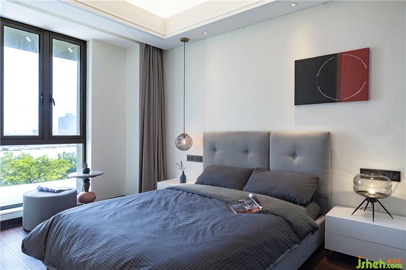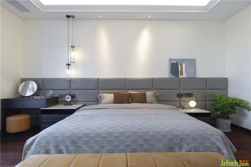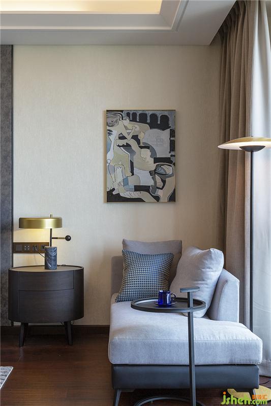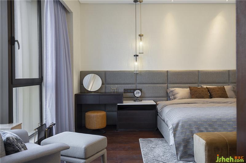 主卧以灰色为主加上姜黄色点亮空间,除基本设施外,添加休闲沙发的组合。一本书,一杯咖啡,一片海,一轮落日,满足你所有的文艺情怀