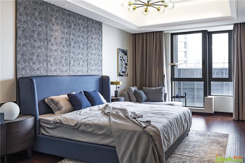 次卧延续客厅的蓝色,墙面增加肌理灰的背景,丰富空间层次。