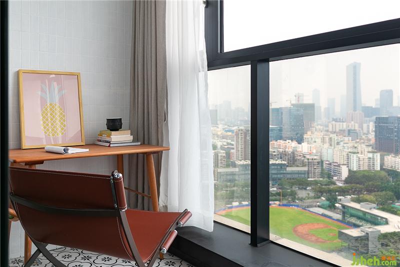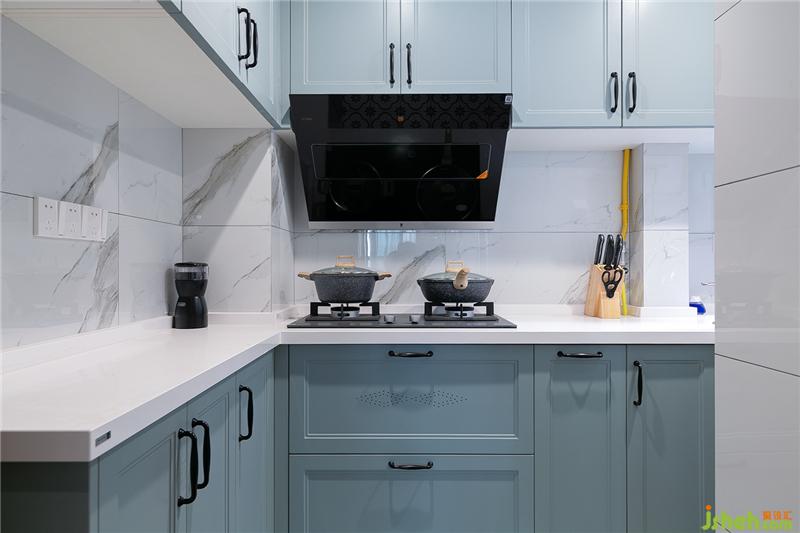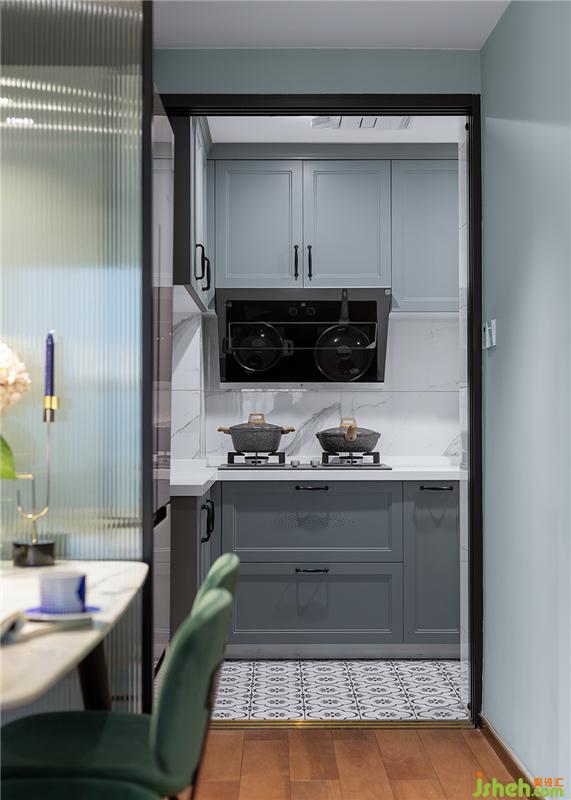 保持厨房的操作空间,冰箱与台面之间有预留三折门防油烟。从右至左洗→切→炒→盛→上桌,一气呵成。室内设计师