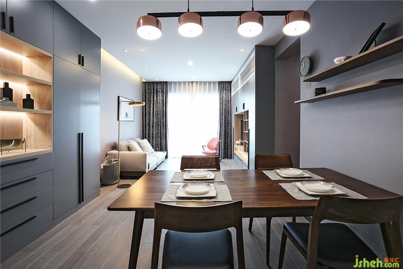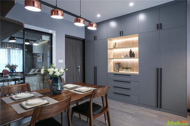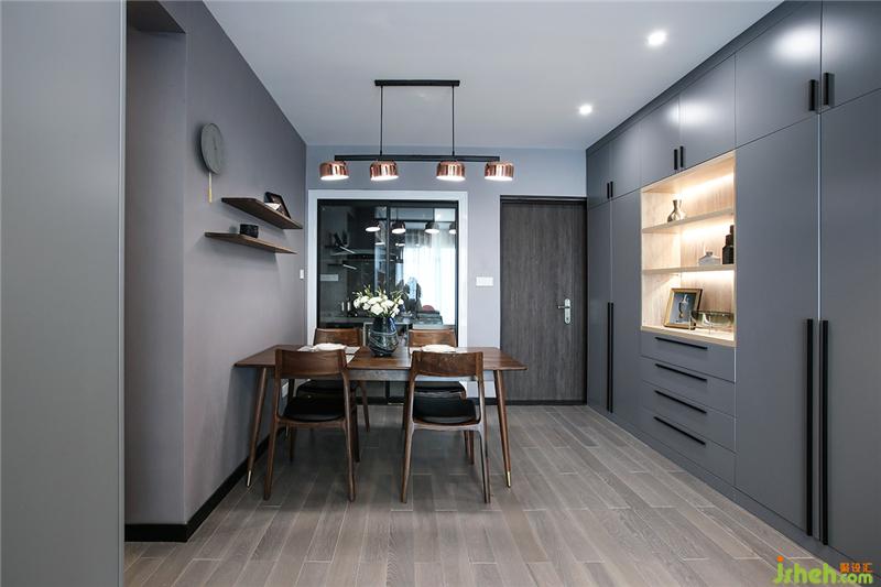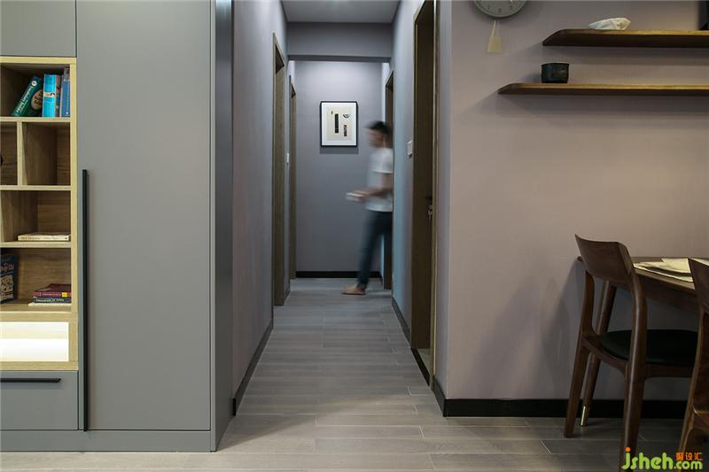 玄关&鞋柜顶天立地的组合简直是收纳神器,而且空间利落显得高大。厨房的门与餐厅连接的墙打通,做成玻璃推拉门。