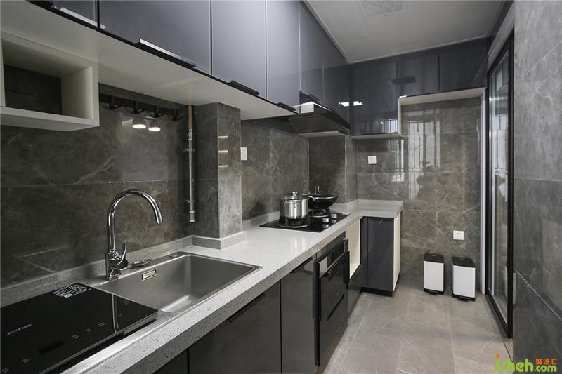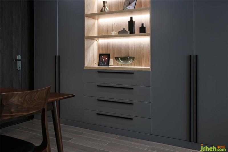 一灰到底,橱柜使用耐污的纳米门板,厨房虽小五脏俱全,因此是设计的重点,屋主不喜欢瓶瓶罐罐或各式料理工具是摆在台面或挂,海边的风尘很大,挂在外面增加收拾工作量。提前挑好消毒柜、烤炉、洗碗机、油烟机保证这些大家伙融入家里时,可以尺寸贴合整洁不会突兀。