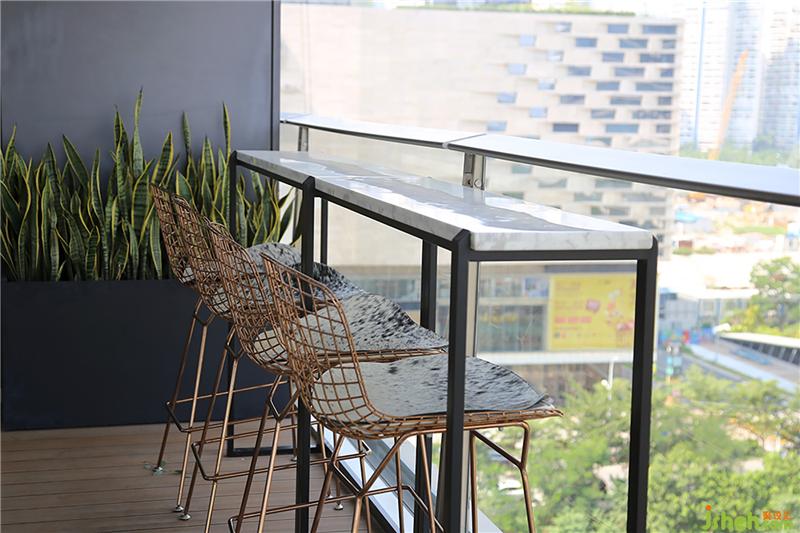 阳台拐角的地方设置一组休闲吧台吧椅,
