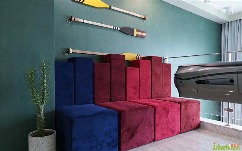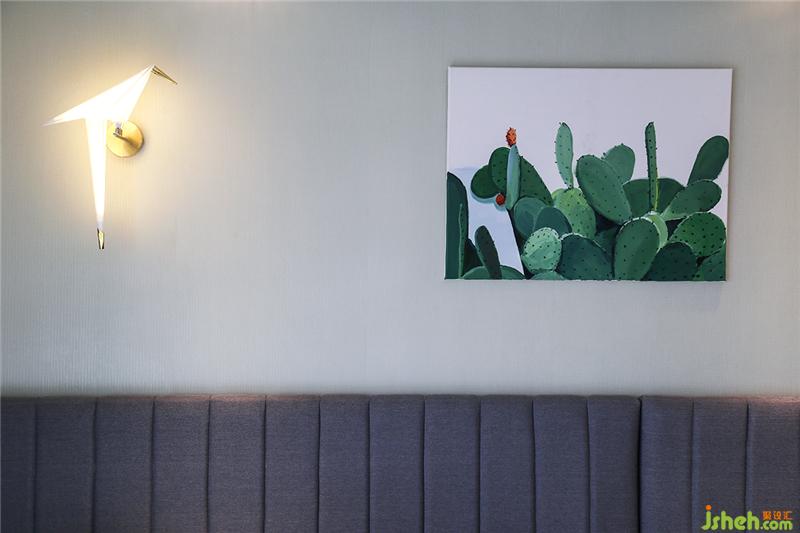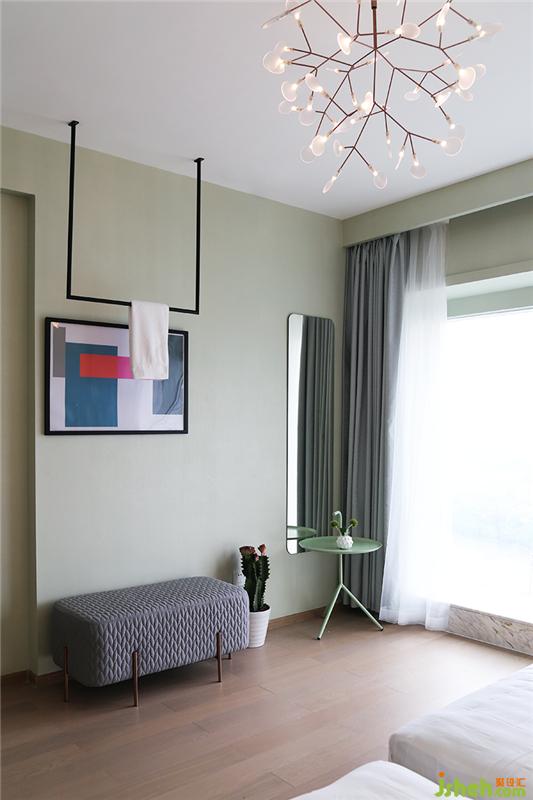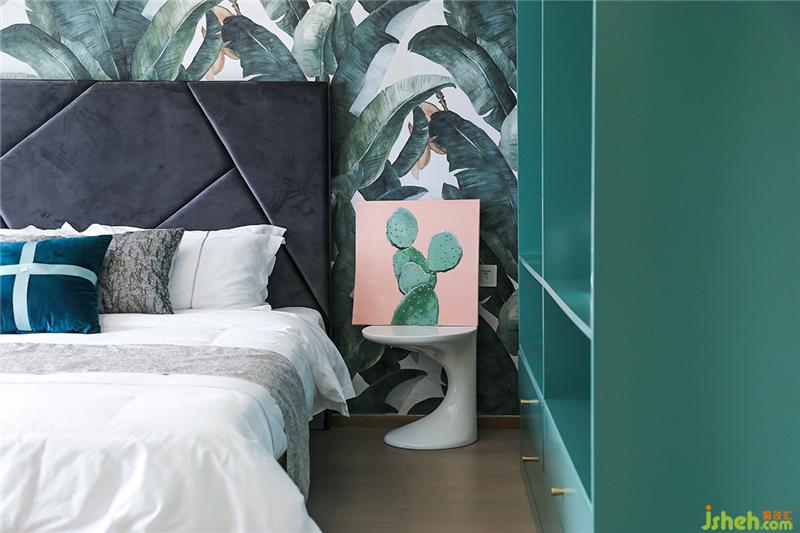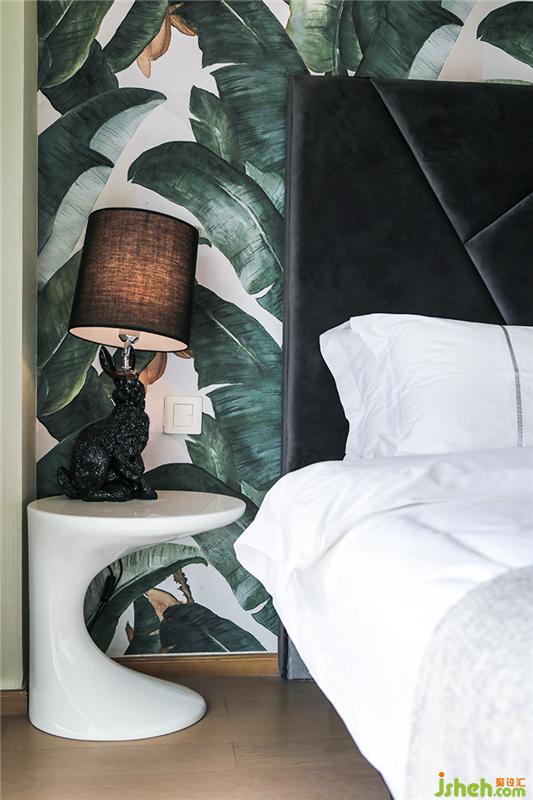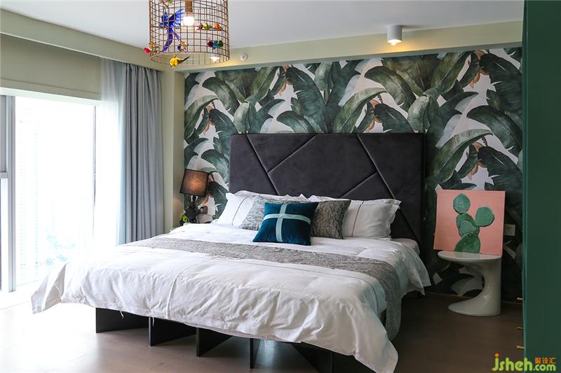 狂欢结束之后,来到二楼的卧室睡个好觉。日出时拉开窗帘,阳光洒在屋内,大块芭蕉叶组合而成的背景墙更显葱郁。