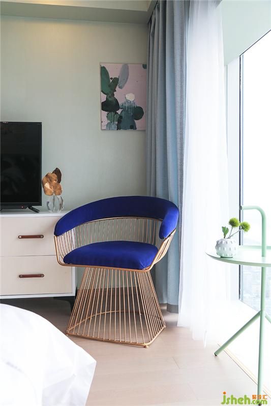 造型简约的深蓝色坐椅卓尔不群,优雅的放在在落地窗旁,坐在上面望向远方,不禁沉迷于这江天一色。