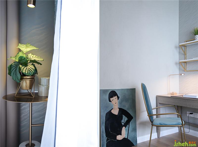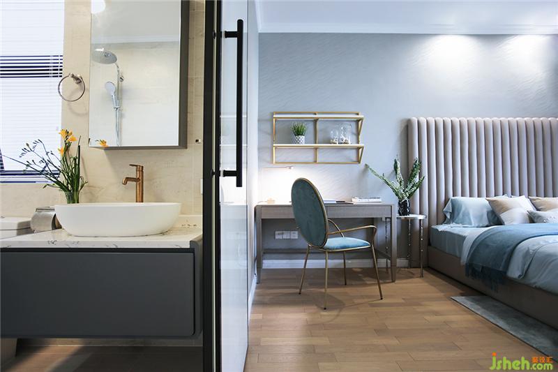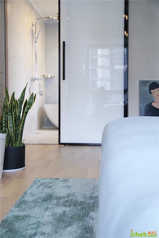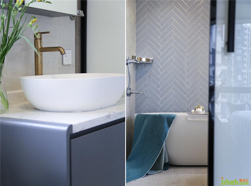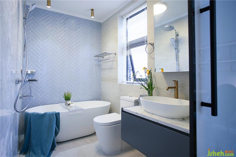靠近卫生间的浴缸墙面,使用浅蓝色的人字拼砖,形成海面的波浪,泡澡的时候也能感受到海的味道。