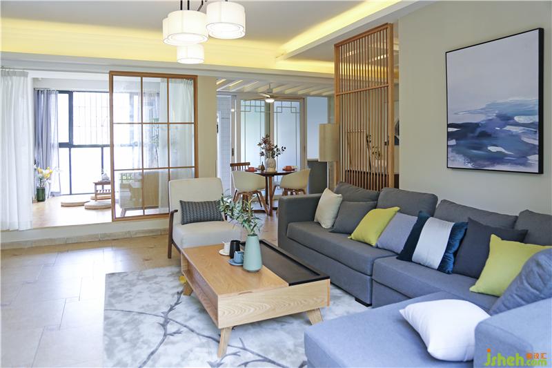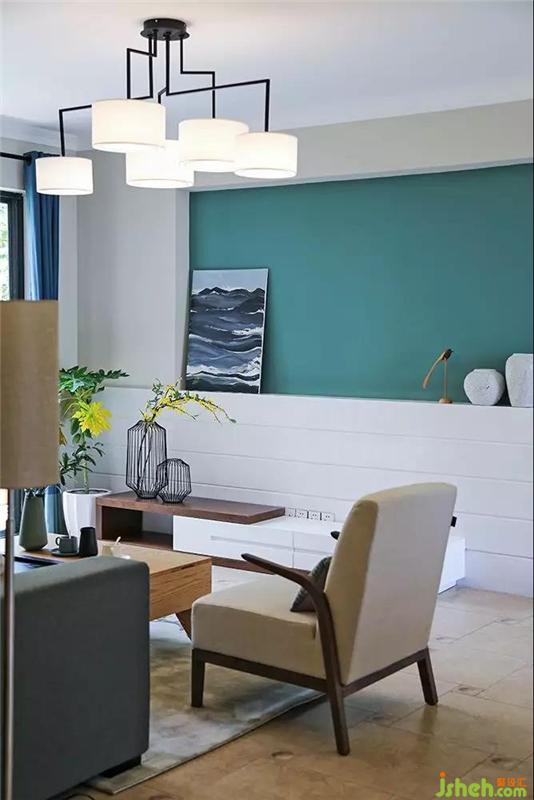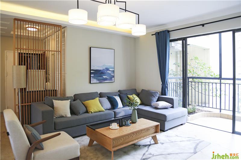 高低错落的铁艺顶灯,日式实木茶几和L型布艺沙发