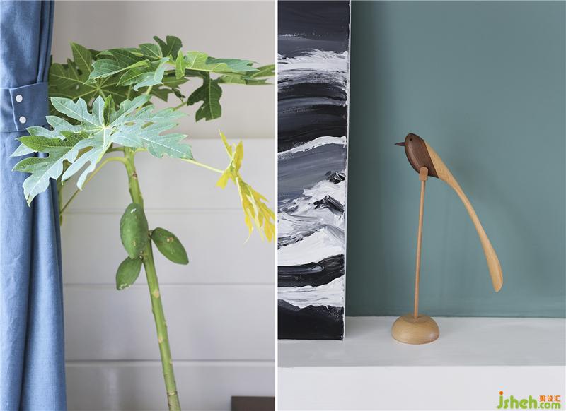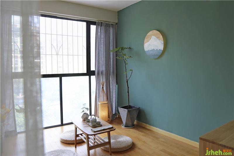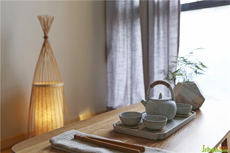 独出心裁将原本的储物间改成了一间茶室,增加了木质玻璃隔断,把客厅的那一抹绿色也搬进了这里,白天闲暇时,拉上窗纱,在柔和光线下,粗陶杯盏里斟满茶水,让静坐在这里品茶的人感受到古朴悠远的禅意。酒店设计