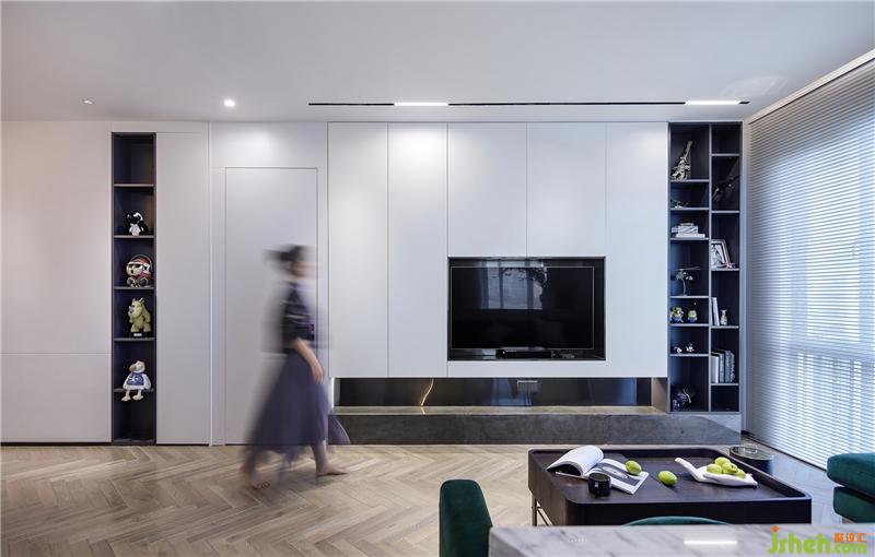 通过天花木饰面材质和异形石材的视觉划分,使得客厅的空间通过分区设计更加方正。主卧房门隐藏在客厅的背景墙面,整体明亮简洁的造型会让空间看起来更加的开敞,同时背景墙隐藏大量储物空间,这也是兜兜需要的一种居住状态。室内设计师