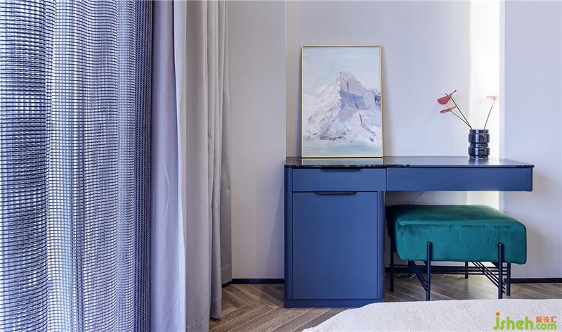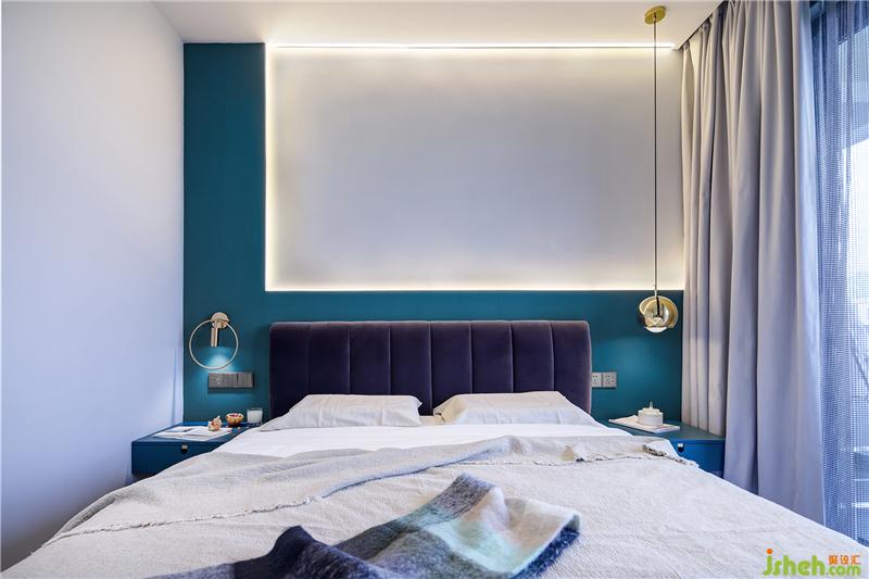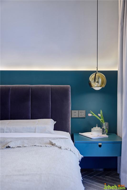 在卧室的色彩关系处理上,色彩的造型、比例、与灯光的关系可以让空间更有层次和氛围,所有的床头柜都做了悬挂的安装方式,便于打扫。室内设计师