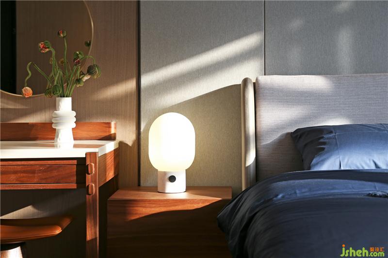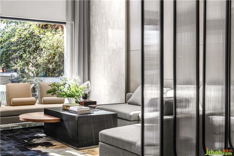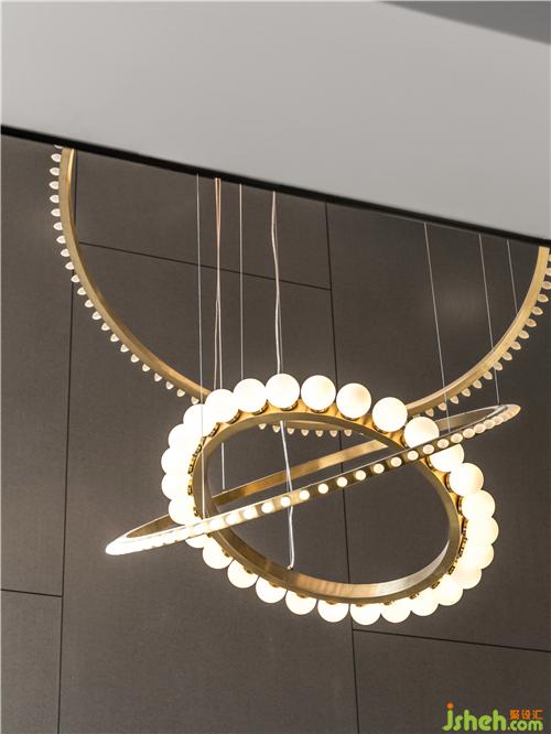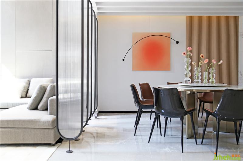 屏风隔断是设计的一个点睛之处,户型南北向进深较长,通过可旋转的弧形的屏风设计,划分空间,保持通透,增加空间层次和趣味,小灯芯的亚克力、木饰格栅、金色不锈钢等元素,感官体验中富有变化。