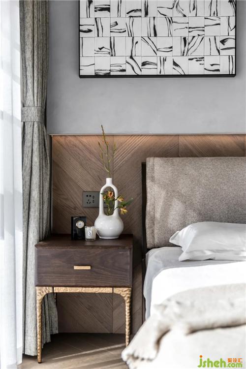 主卧的背景墙灰色与木色,一个温暖一个冷静和抽象的画面形成空间构成。