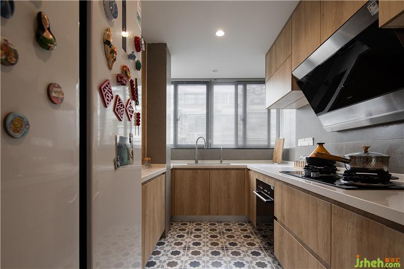 ▲厨房-复古花砖与暖棕色的木质色彩搭配,给人娴静、舒适的感受。
