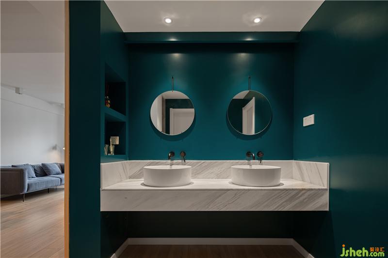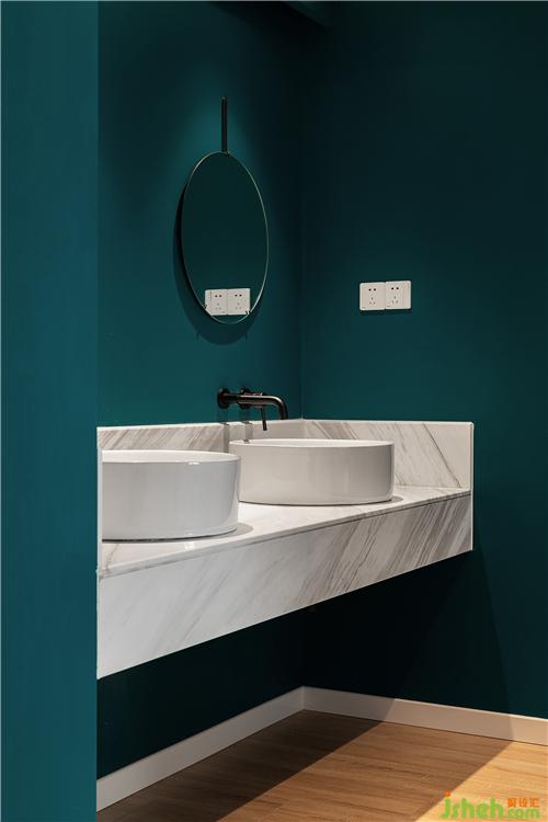 与主卧相邻的盥洗室,与之呼应,运用了同色调。在保证干湿分离的同时,设计师最大化利用空间增加了双台盆设计,展现了设计师对营造高品质生活的追求。