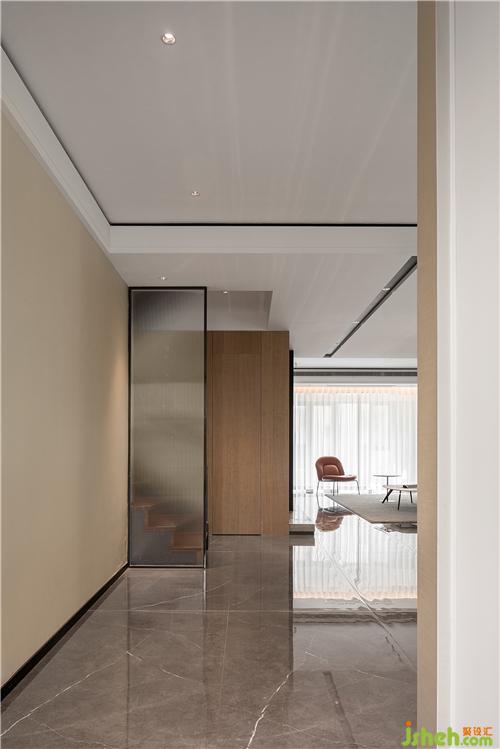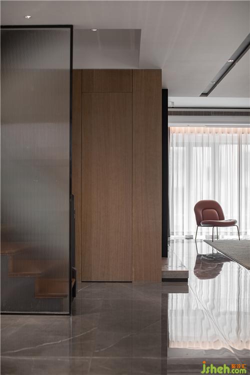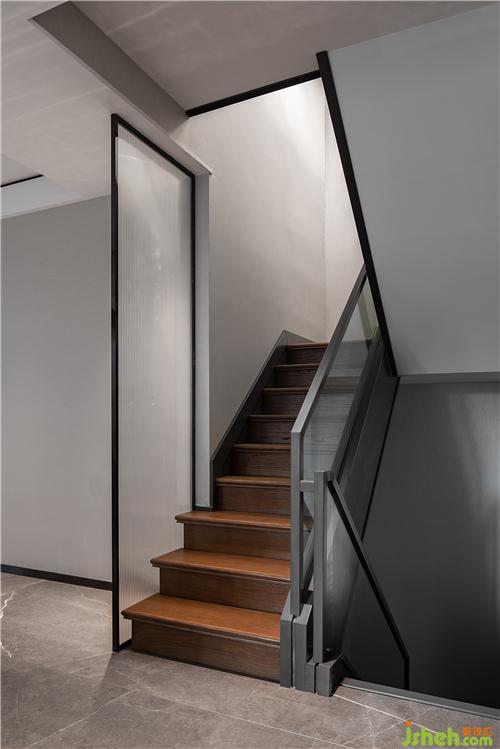 随着旋渐向上的空间,生活逐渐变得私密而静谧。楼梯,作为空间转折的一个节点,设计师运用了磨砂玻璃做其挡墙。淮安别墅装饰在阻隔视线保护隐私的同时,强烈的虚实对比也构成了一种美学的微妙平衡状态。