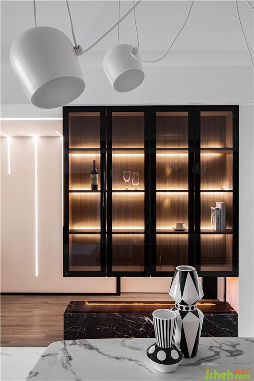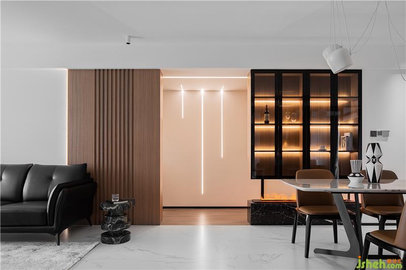 一旁的餐厅背景设计为黑框玻璃展示柜,其上部从顶面往下生长,