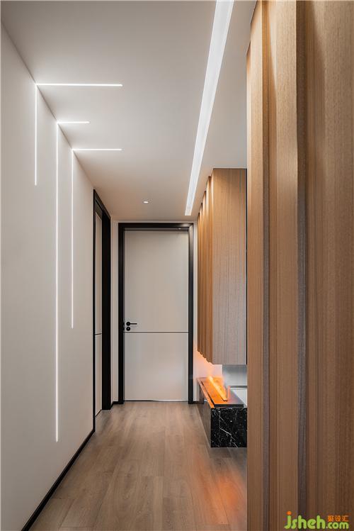 △通往主次卧的廊道以暖木色材质为主,烘托出温馨的质感。照明以嵌灯为主让整体空间更洁净内敛。