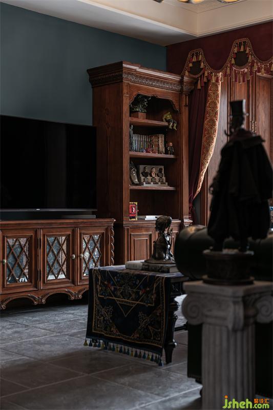 墙纸窗帘都用了复古的酒红色系,与墨绿相碰撞,这种高饱和度的颜色对比更能体现古堡和宫廷的华丽和张扬,丝绒和羊毛材质搭配温润的木头,又能增加空间的质感,更贴合古堡的风格,茶几上的暗黑小丑兔邪恶又迷人~强行入镜。