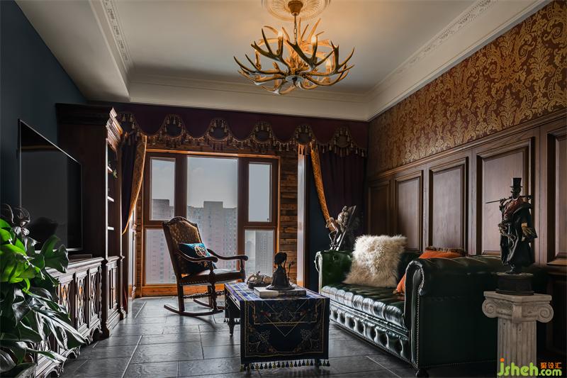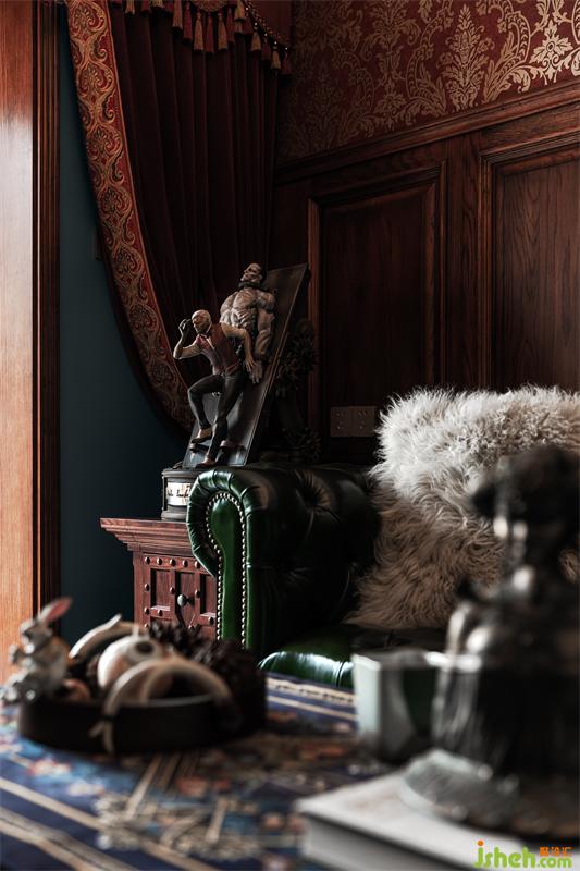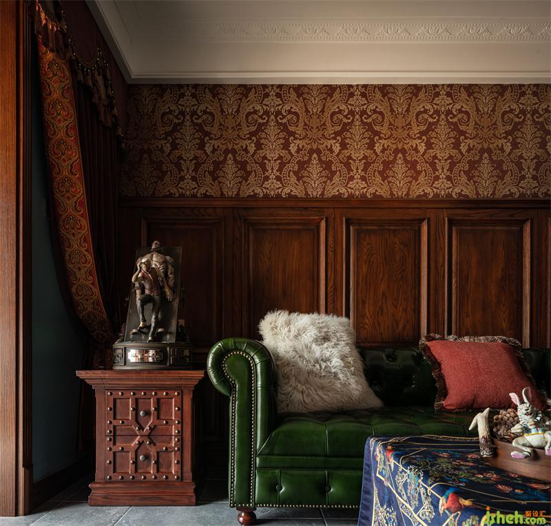 客厅采用了古堡里常用的墙板搭配大马士革壁纸,华丽又复古,地砖也用了仿古砖,增加一点粗犷和沧桑感,沙发选用了墨绿色的切斯特菲尔德沙发,搭配一把皮质的摇椅,摇椅的靠背是皮毛的,温暖又野奢,粗犷又舒适。沙发两边的手办是家里最大号的两个,用自己的心爱之物当装饰,家就有了自己的味道。