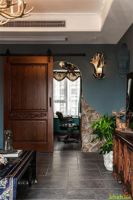 客厅看主卧。雕花的橡木谷仓门,搭配裸露出原石的破败墙脚,仿佛一个久久无人问津的古堡里,隐藏着一个跨世纪的惊天大秘密……(此处有bgm~)鹿角壁灯昏暗的灯光既增加氛围,也能在晚上照亮过道这一主动线,有颜又实用。