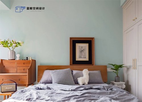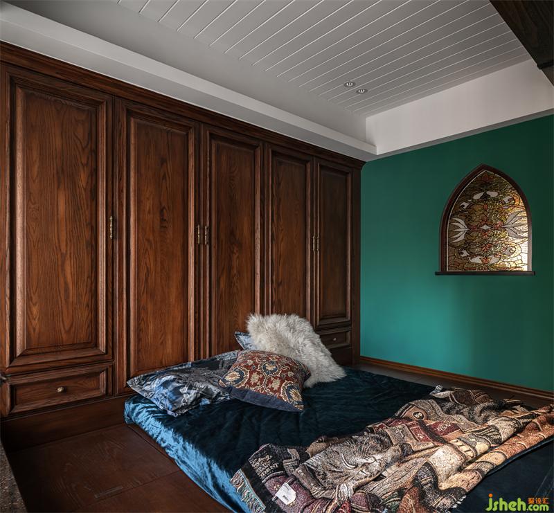 主卧采用榻榻米的形式,增加储物,衣柜做成墙板的样式,既是背景,又有实用性。墙上的教堂玻璃对着过道,增加过道的自然采光。