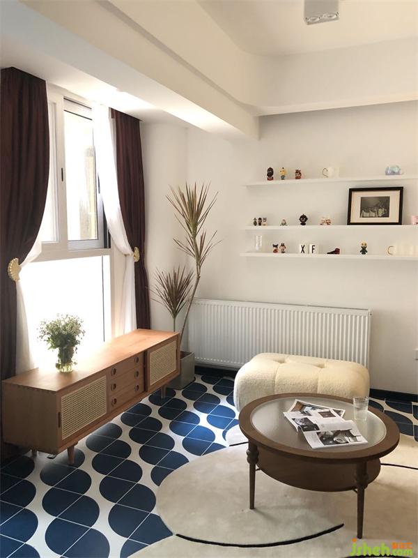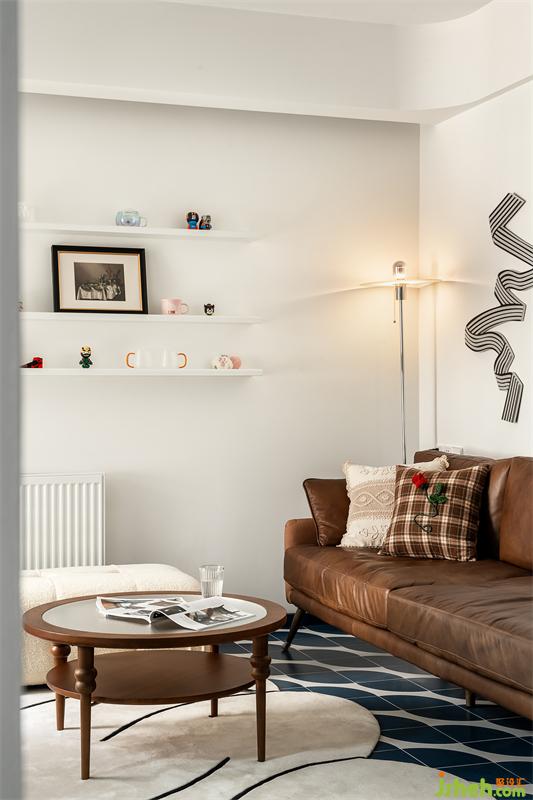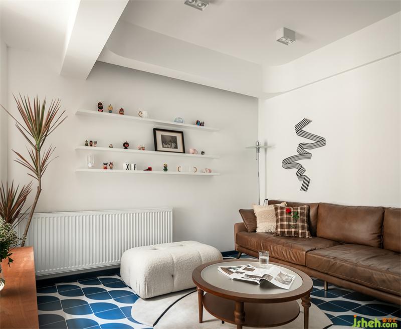客厅地面贴了几何形状的地砖,让空间更有动感。一进门就能看到的墙面上做了层板架,放置主人从各地收罗来的纪念品和公仔,打破了传统的“沙发背景”和“电视背景”的背景墙模式。