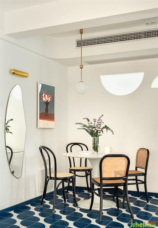 圆形的餐桌能弱化墙角的空间感。进门口选了不规则的造型镜子,方便出门之前整理着装,也能增加空间的层次感。