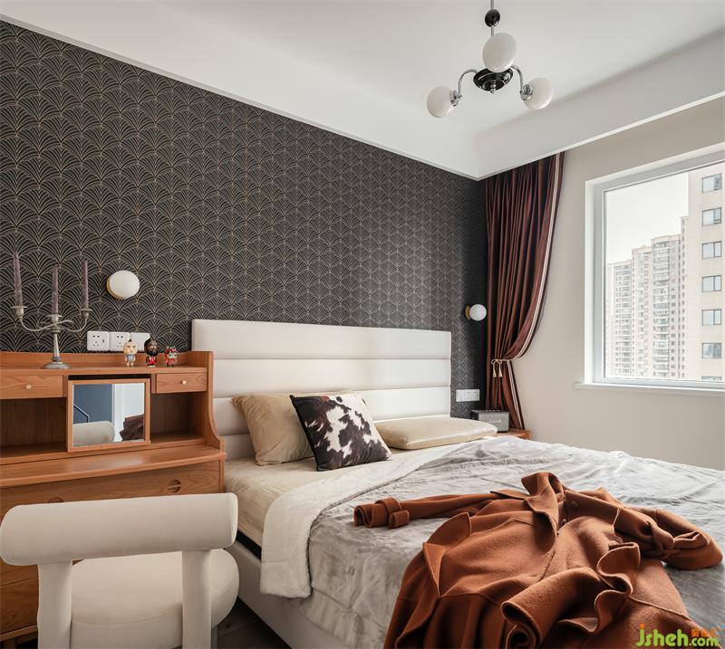 主卧是采光最好的房间,采用深蓝色的墙纸既呼应了主题色,又增加卧室的静谧感,白色的皮床干净又有张力,圆球形的壁灯俏皮可爱,宛如两颗珍珠挂在床头,提升了空间质感。