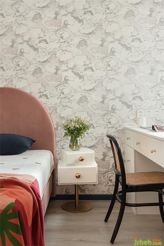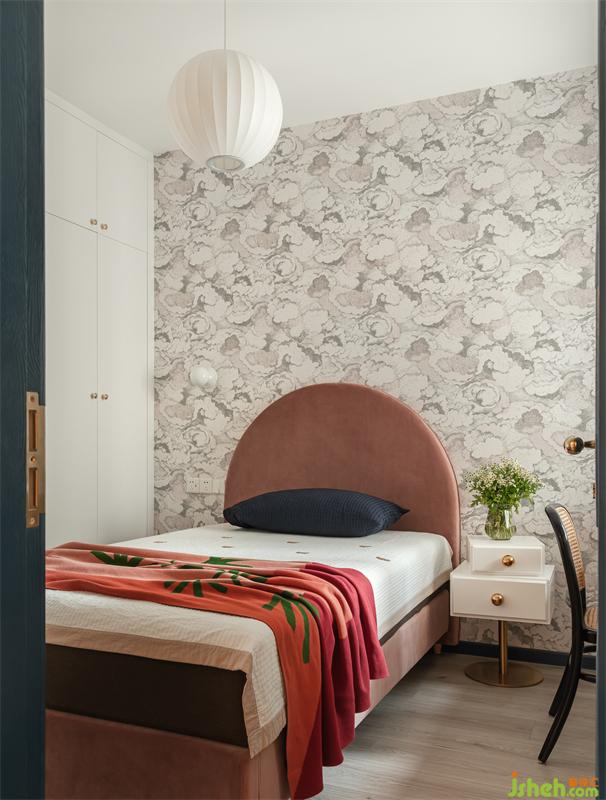 女儿房用了淡粉色的云朵墙纸,云朵仿佛在移动,有种静谧的活力。粉色的半圆床头将公主心进行到底,俏皮可爱,最鲜艳的针织搭毯则是点睛之笔,把空间主题色的饱和度,从墙纸到床到搭毯,由低拉到最高,层次分明。