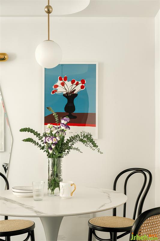 高饱和度的画作能彰显屋主的个性,在餐桌不摆花的时候,也能给与生活仪式感,还能遮挡背后的强电箱。球形吊灯简约精致,呼应空间的弧度。