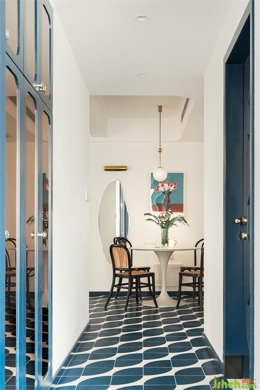 从主卧的门口看走道及餐厅。吊顶也做成了弧形,用造型感削弱空间的局促感。左边借了墙厚做了一排储物柜,柜门镶嵌了茶镜,扩大了空间感。