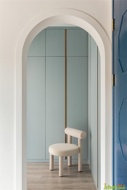 主卧通向衣帽间的门洞也采用了弧形的设计,衣帽间比较小,选了更温和的灰绿色,莫兰迪色系在视觉上有收缩功能,能让空间显得更宽敞更让人放松。公主的衣橱就是要爽朗精致。
