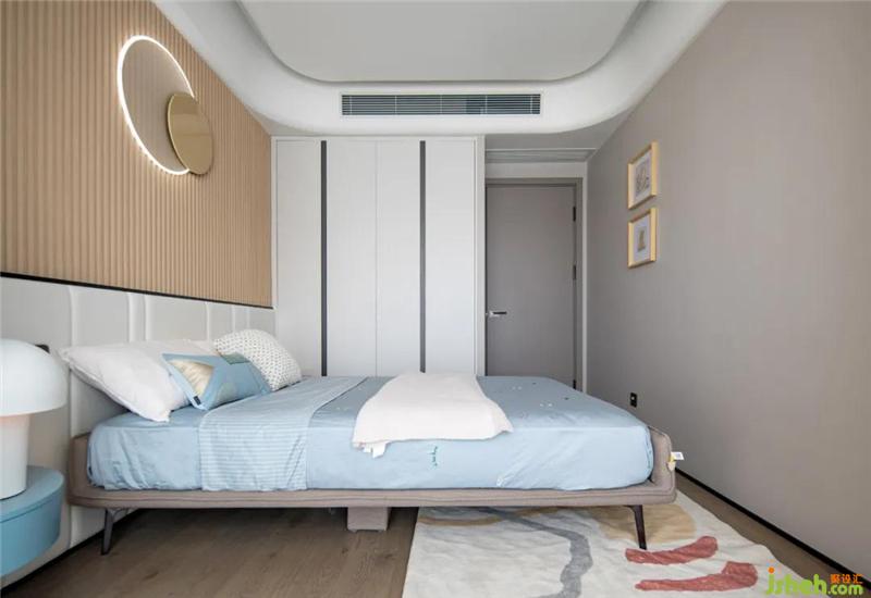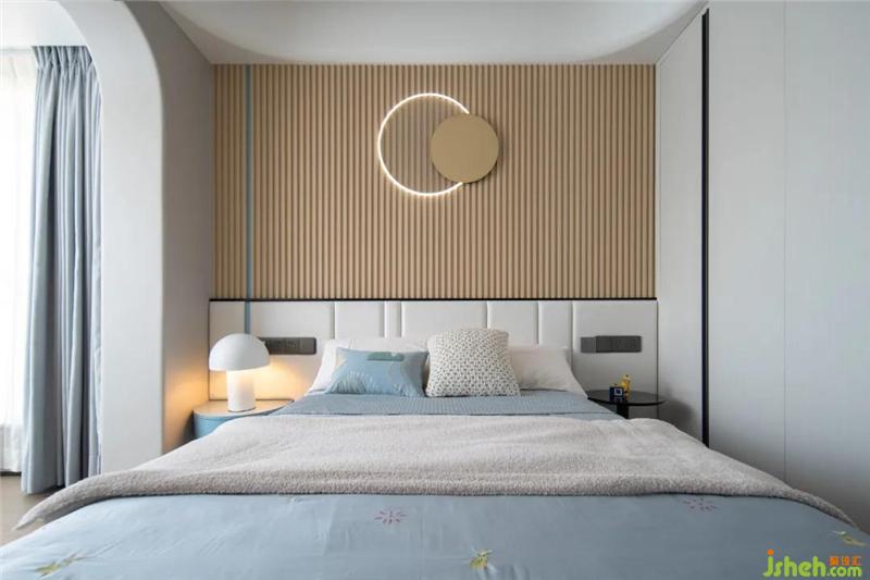 儿童房床头是硬包+长城板的组合,圆形的装饰灯与蘑菇灯弱化了生冷的线条感,以局部的蓝色作为点缀,彰显童趣。深圳室内设计师四件套可根据日后小朋友的喜好更换,无需变动硬装,相对更加节约成本。