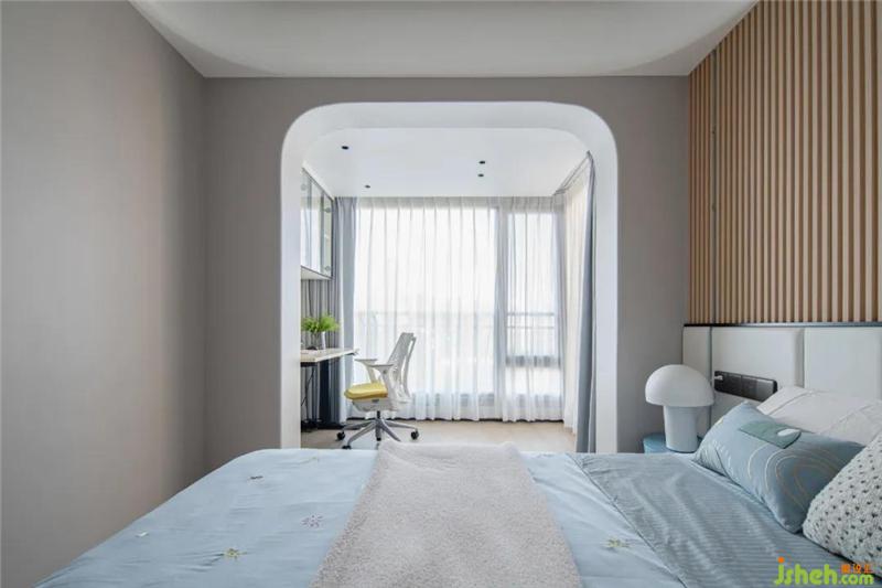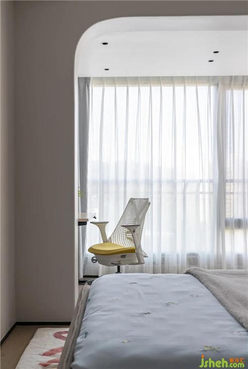 儿童房的天花及连接阳台区域的门都做了弧形的设计,生硬不再而圆润有加。抛去常规直来直往的线条带来的冲击,更适合小朋友~