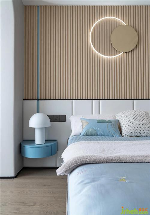 蓝色半圆的悬空床头柜,可以有效避免直角带来的冲击与伤害,颜值也十分在线,很推荐备给儿童房。