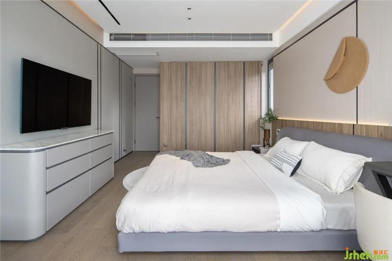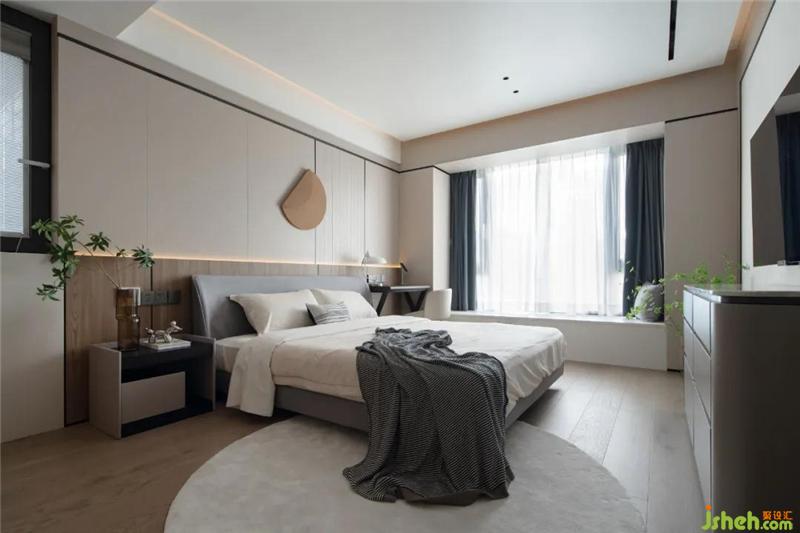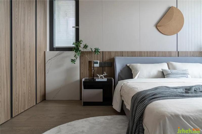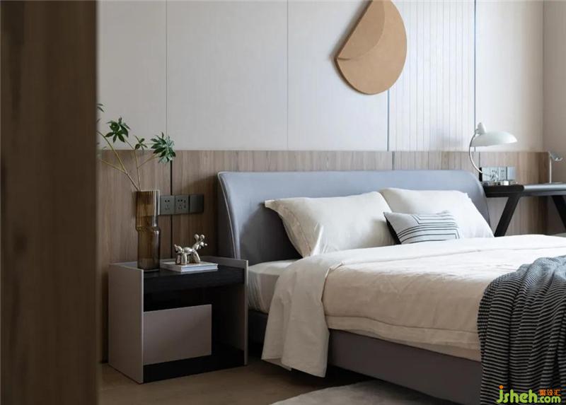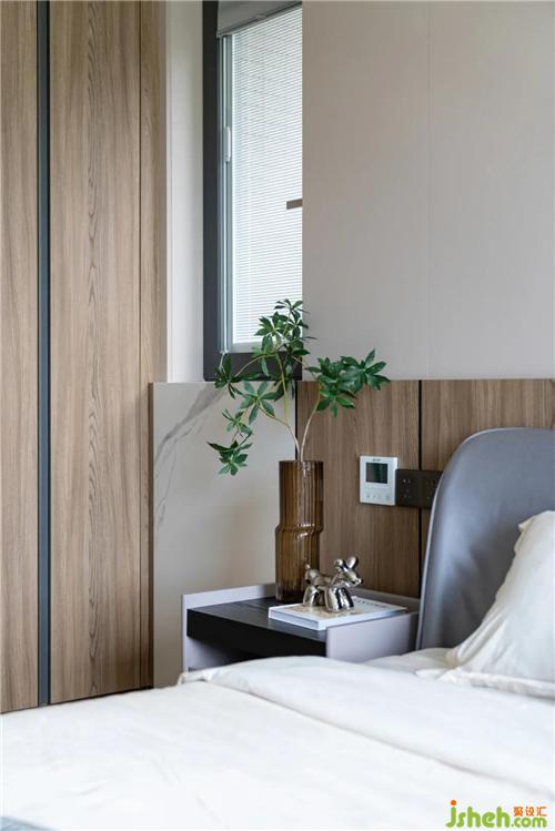 床头两侧做了床头柜+小办公桌的设计区分功能。房间不管是衣柜、床头背景或是地板均辅以木材,温馨也更环保健康。细看钢条点缀细节,以致于不那么沉闷。