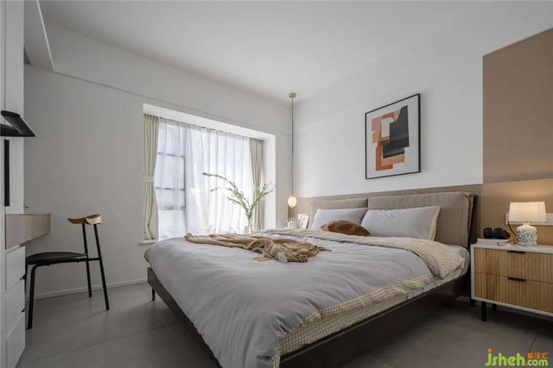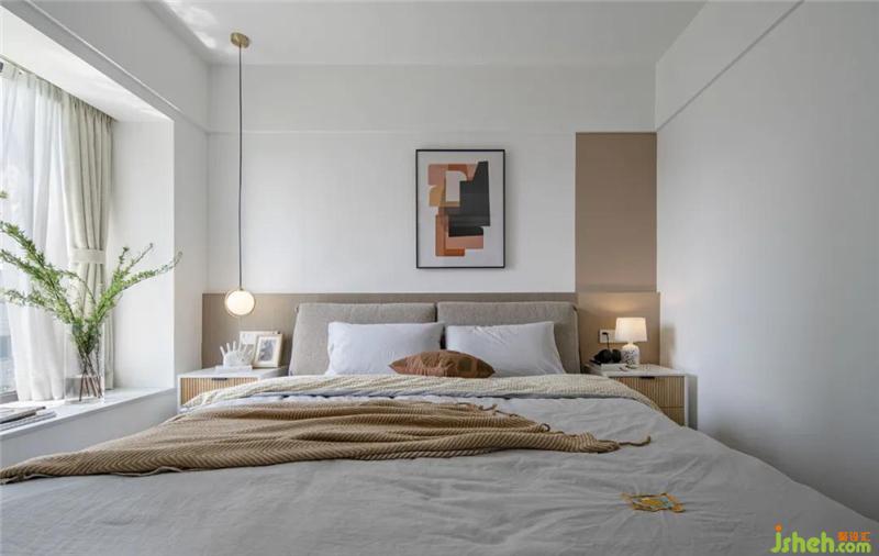 主卧床头背景木饰面与乳胶漆的结合,另一侧做上吊顶使得空间更平衡,护墙板的灯带在晚上也不会刺眼,躺着看书更加惬意。