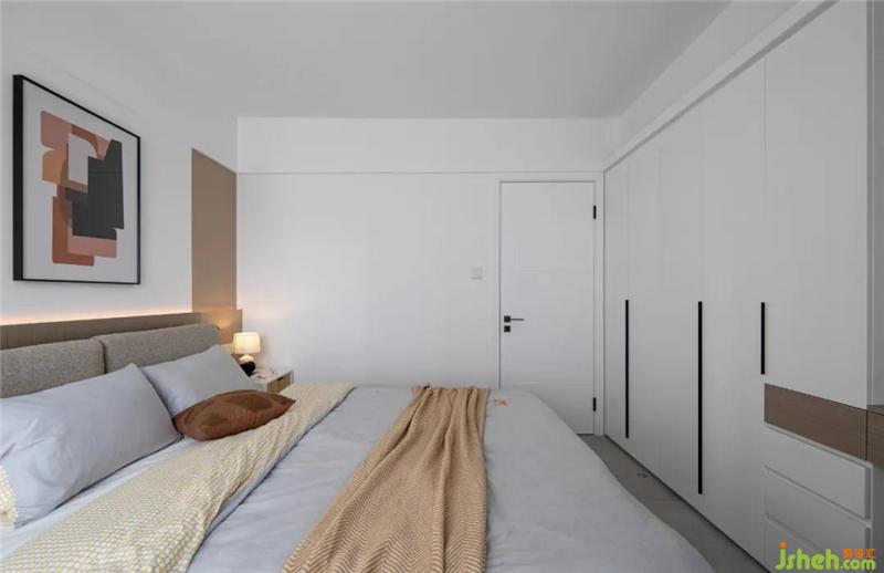 床尾一整排超大的收纳+梳妆台的结合,满足强大衣物收纳的同时最大化利用空间,白色的柜门与整体的墙面一致,整体干净美观。