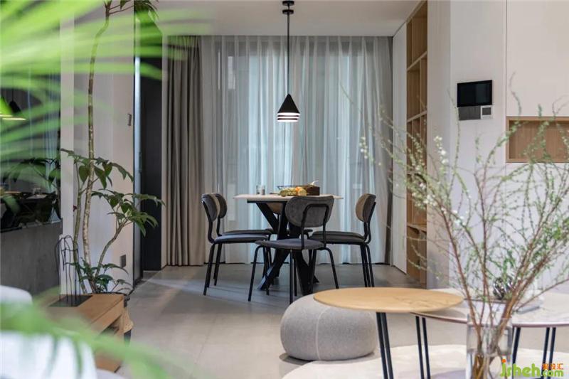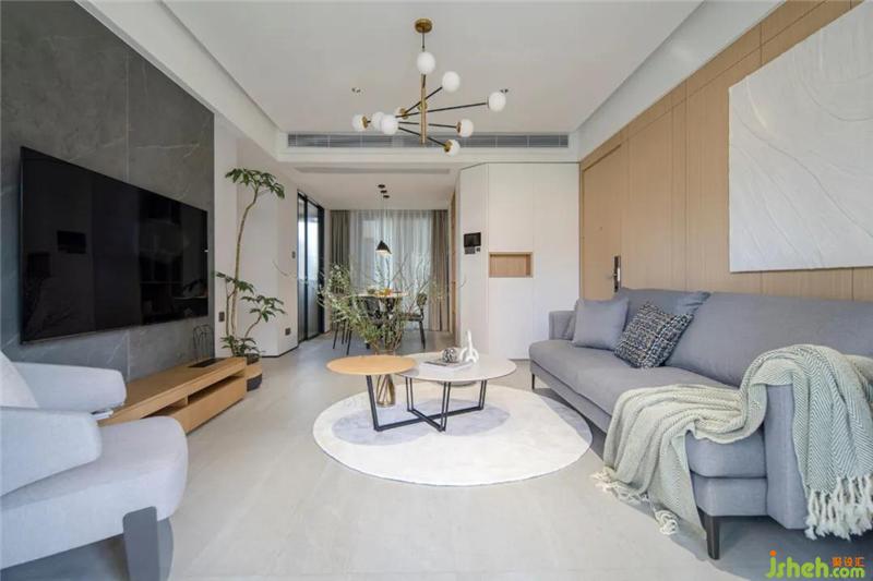 阳台看向客餐厅区域,软装家具的选择上,以灰色为主调,些许木色的撞色,绿植的搭配给空间增加了一些活跃的感觉。