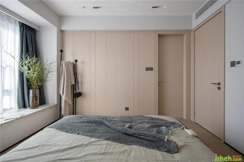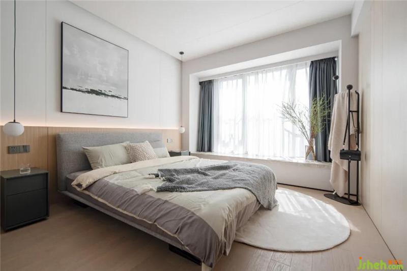 主卧整体延续了客餐厅的设计,床头背景墙从天花一直延续到地面,两种不同材质的碰撞,丰富了整个背景墙。
