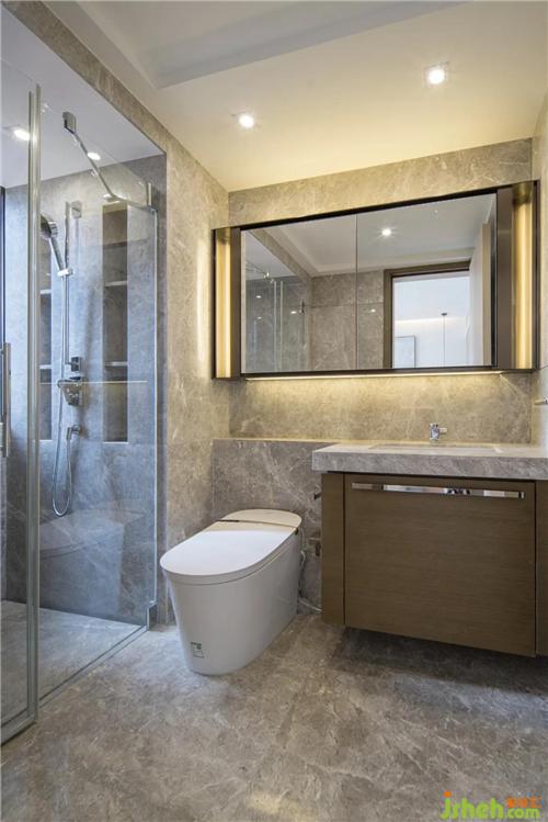 卫生间没有做改动,主卫公卫一致,简洁的三件套,做了干湿分离,镜柜可以让日常使用的洗护用品避免长期处于潮湿的环境,后面的灯带营造出氛围,也更方便使用。