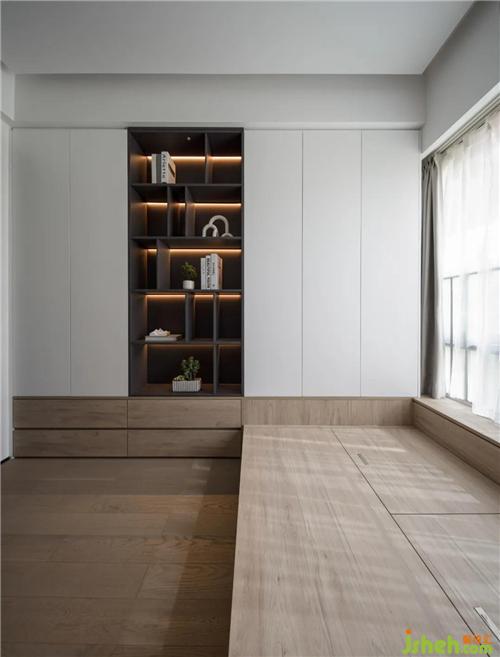 采用榻榻米的设计,增加了储物功能,也能满足家中长辈偶尔入住的需求。床尾做了一面开放+封闭式的柜子,封闭式柜子储物功能十分强大,换季的衣物及被褥统统都能放进去。