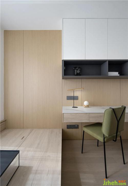 床头一侧除了留出的办公的位置及吊柜,其他都用木饰面做了装饰,与客餐厅整体风格一致。