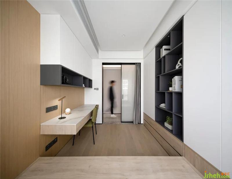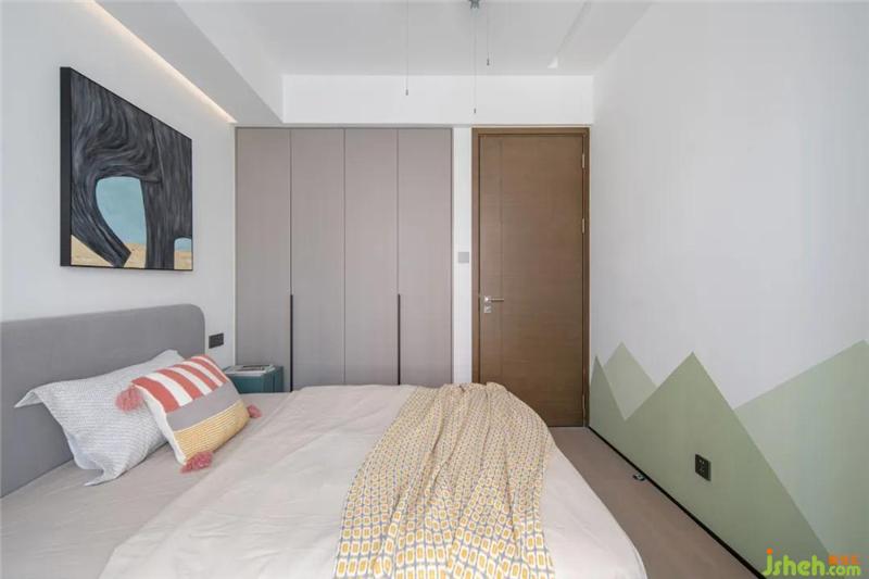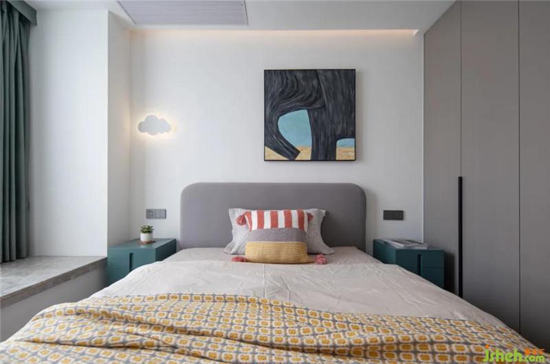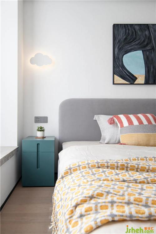 屋主家里目前还没有小朋友,所以儿童房的设计没有做很多趋于性别化的细节,云朵灯及大象的装饰画充满童趣深圳装修设计,床尾用深浅不一的青绿色点缀也很清新活力,床品选用中性的灰色,以后可以根据小朋友的喜好更换四件套等软装物品,无需动硬装。